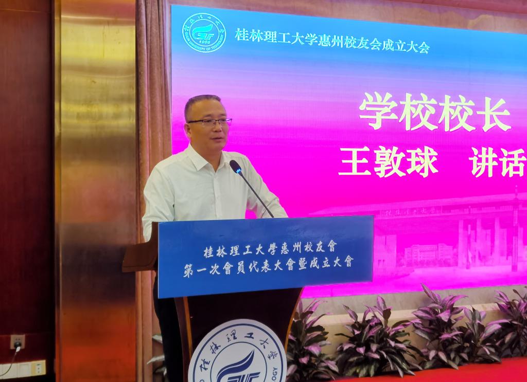 王敦球代表学校对惠州校友会的成立表示热烈祝贺,向惠州校友表示亲切问候,对广大校友为惠州经济社会发展作出的贡献表示崇高敬意,并向惠州校友介绍了学校近年来的发展情况,就今年举行89级校友毕业30周年、99级校友毕业20周年返校活动进行了说明。王敦球指出,校友是母校最靓丽的名片,是母校的光荣与骄傲,是母校的巨大资源和宝贵财富,也是母校前进最可信、可依靠的重要力量。今年是beat365官方网站建校67周年,学校正深入实施质量立校、科研兴校、人才强校、依法治校、开放活校、文化塑校、管理促校、和谐美校“八大工程”。他希望惠州校友会要为校友联络牵线搭桥,服务校友事业、助力母校发展,把校友会建成密切联系和热忱服务广大校友的平台,为建设特色鲜明、国内知名的高水平理工大学多作贡献。同时也期盼广大校友能够继续关心和支持校友工作,互相帮助,共创美好未来!