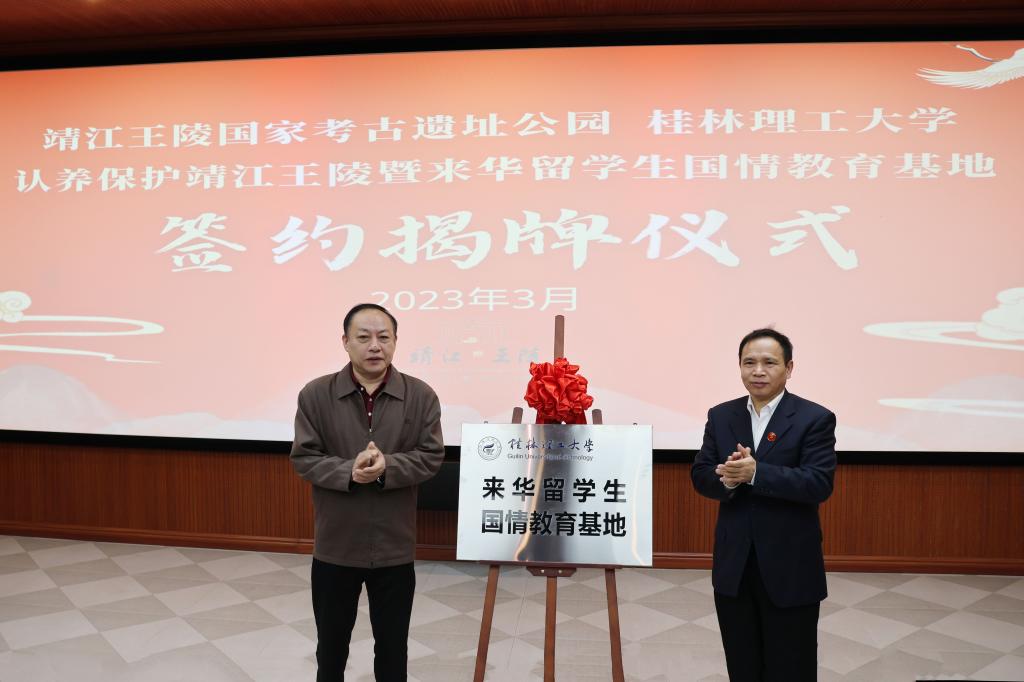 学校副校长周国清和桂林市文化广电和旅游局党组副书记、副局长曾小林共同为来华留学生国情教育基地揭牌