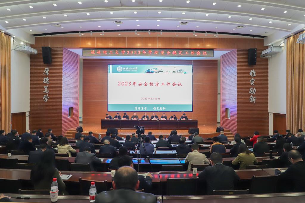 学校党委书记邓军作题为“守土尽责 担当作为 努力让平安桂工基础更牢”的讲话。他指出,过去一年,在大家的共同努力下,学校校园总体安全稳定文明和谐,有力保障了各项事业加快发展高质量发展。他就做好学校2023年安全稳定工作提出三点要求:一是深入学习贯彻习近平总书记关于安全稳定工作的重要论述和重要讲话精神,进一步增强做好学校安全稳定工作的政治自觉和行动自觉。要坚决贯彻落实习近平总书记关于安全稳定重要指示批示精神;要牢固树立抓校园安全稳定就是守住发展基石的政治自觉;要牢固树立全校上下齐心合力抓安全稳定的责任担当意识。二是准确把握学校安全稳定工作形势,精准发力完善安全稳定工作长效机制。要健全协调一致的领导管理机制;要健全层次分明的属地责任机制;要健全及时畅通的应急处置机制。三是压紧压实安全稳定工作责任,确保学校安全稳定各项工作举措落实落细。绷紧“安全弦”,进一步增强维护校园安全的责任感紧迫感;上好“安全课”,进一步提高师生安全防范意识;织密“安全网”,进一步强化隐患治理和协调联动;学好“安全法”,进一步提高安全稳定工作法治化规范化制度化水平;系好“安全带”,进一步压紧压实安全稳定责任。