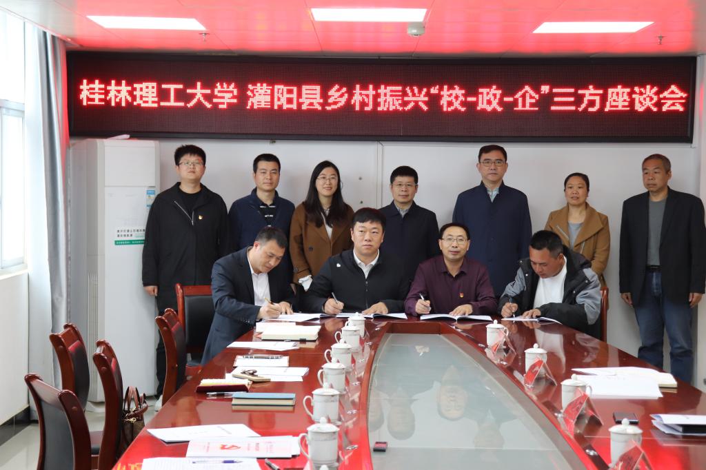 与会领导共同见证了测绘地理信息学院与企业联盟代表签订“校-企共融共通助力乡村振兴共建协议”。会后,邓国彬一行来到灌阳县高山源农业科技公司为“beat365官方网站科技成果转化基地”揭牌,赴学校定点帮扶永富村、三树村开展调研。