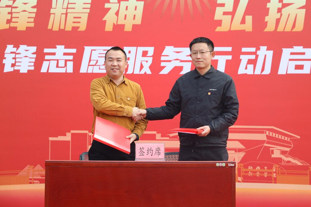 启动仪式上,唐壮东、叶昊、邱杰分别为学校和各二级学院大学生青年志愿者服务队授旗;学校青年志愿者代表、第25届研究生支教团志愿者李家松发出学雷锋志愿服务倡议,并带领全体志愿者进行宣誓;学校团委和雁山区团委签订了实施“大学生社区实践计划”协议。启动仪式后,学校举行了“生命延续 奉献爱心”无偿献血等12个志愿服务同期活动。