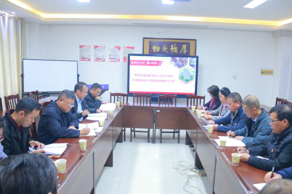 2月23日至24日,学校党委书记邓军先后到外国语学院、商学院走访调研,强调要认真贯彻落实学校第三届党委第五次全体会议精神和2023年工作布置会要求,坚定不移重实效、强实干、抓落实、求突破,进一步增强推动学校加快发展高质量发展的责任感、使命感、危机感,肯定成绩、坚定信心,乘势而上、勇毅前行,强力推动学校各项事业加快发展高质量发展。
