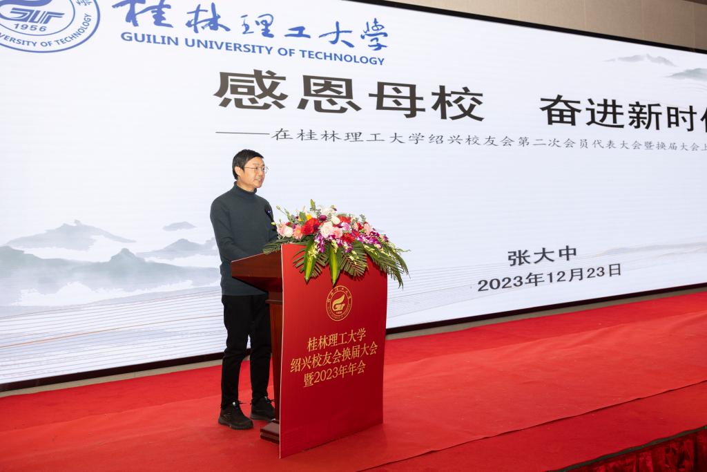 王敦球在讲话中充分肯定了绍兴校友会第一届理事会全体成员为校友会建设作出的突出贡献,对绍兴校友会的成功换届表示热烈祝贺。他指出,校友是母校最靓丽的名片,是母校的巨大资源和宝贵财富,也是母校前进最可信与依靠的重要力量。当前学校正全力推进特色鲜明、国内知名高水平理工大学建设,更需要来自广大校友等各方力量的鼎力支持,不断提高学校的知名度和美誉度,为学校贡献更为强劲有力的桂工校友力量。他表示,本次绍兴校友会换届,标志着绍兴校友会的组织建设正在逐步完善,拓展了母校与校友、校友与校友之间的沟通联系渠道。他希望绍兴校友会切实发挥桥梁与纽带作用,积极助力校友发展;期待广大校友积极支持校友会工作,不断增强凝聚力;期待广大校友密切与母校的联系,携手共创美好未来。