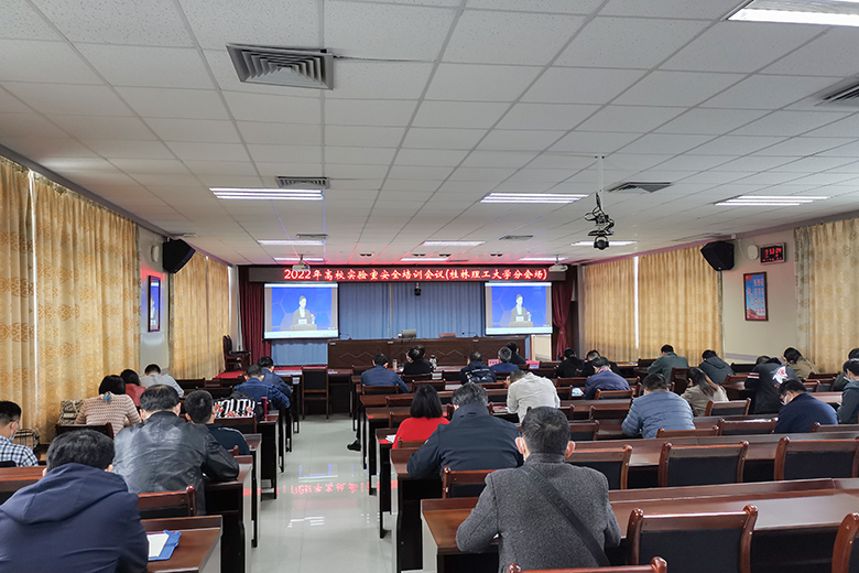 beat365在雁山校区行知楼A406会议室设立分会场。学校副校长梁福沛、邓国彬,教务处、科技处、保卫处、研究生院等职能部门相关人员,各二级学院分管实验室工作副院长、实验室各级管理人员近150人参加了视频会。南宁分校设立第二分会场参加会议。