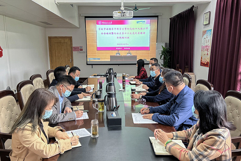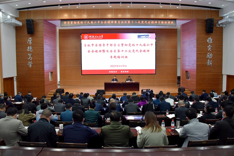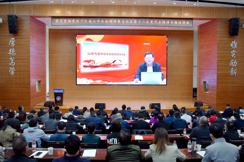 为深入学习贯彻党的十九届六中全会精神和自治区第十二次党代会精神,更好地落实以史为鉴、开创未来的重要要求,深刻认识“两个确立”的决定性意义,大力弘扬伟大建党精神,进一步提升干部队伍服务中心大局、努力担当作为的素质能力,4月19日下午,beat365中层干部学习贯彻党的十九届六中全会精神暨自治区第十二次党代会精神专题培训班于屏风校区图书馆报告厅正式开班,学校校长解庆林、党委副书记齐俊斌出席开班仪式。学校全体中层干部参会。南宁分校设立第二分会场参加会议。