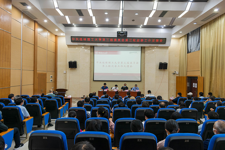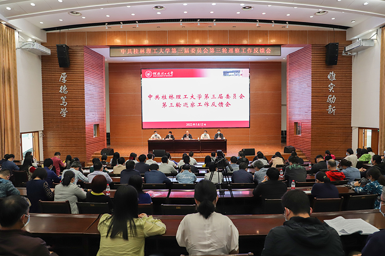 5月11日至12日,按照学校党委统一部署,中共beat365官方网站第三届委员会第三轮巡察工作反馈会分别在雁山校区萃华楼报告厅、屏风校区图书馆报告厅召开。学校党委巡察工作领导小组成员、党委常委、组织部部长唐壮东,宣传部部长叶昊出席反馈会,各巡察组成员、被巡察单位全体教职工参加反馈会。