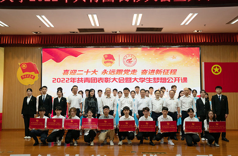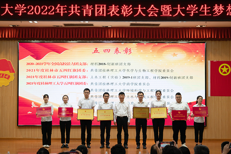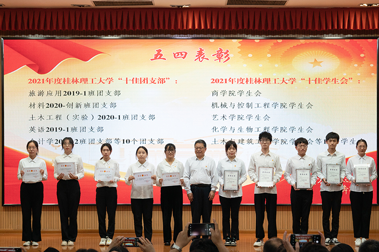 在表彰环节,与会领导分别为荣获2021年度全国高校活力团支部、2021年度桂林市“两红两优”先进集体和先进个人、学校共青团“十佳”系列先进集体和先进个人以及在各类社会实践、创新创业和校园文化活动中获奖的先进集体和先进个人颁奖。