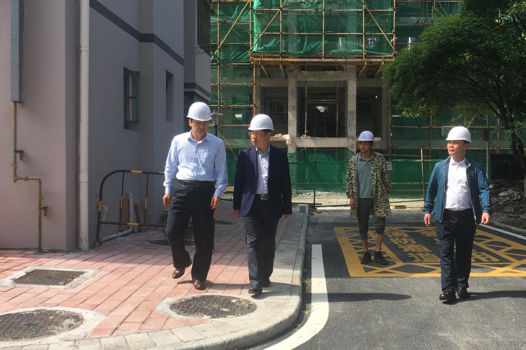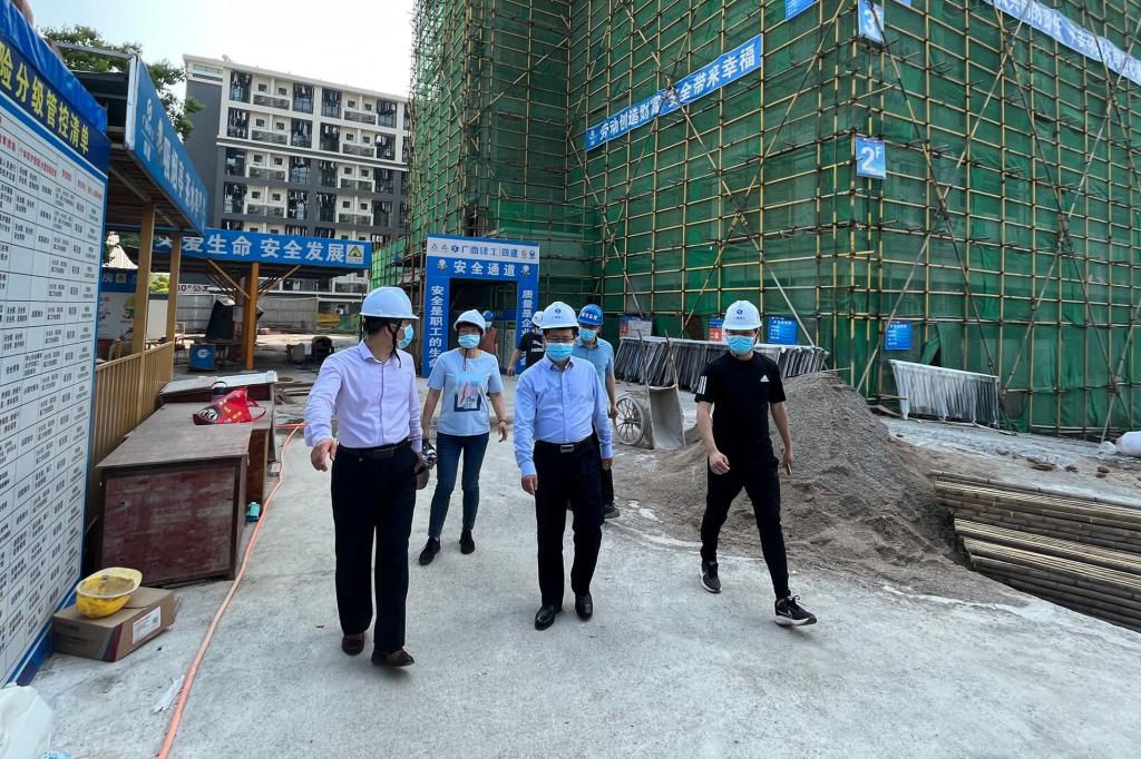 邓国彬一行先后来到雁山校区32栋研究生宿舍楼施工现场和屏风校区、东城老旧小区改造项目现场,重点了解了工程进度、工程质量安全、工地疫情防控及工地安全隐患排查整改等工作,就老旧小区改造后期工作安排、教职工既有住宅加装电梯供电等问题以及施工现场的安全隐患排查整改进行了现场检查。