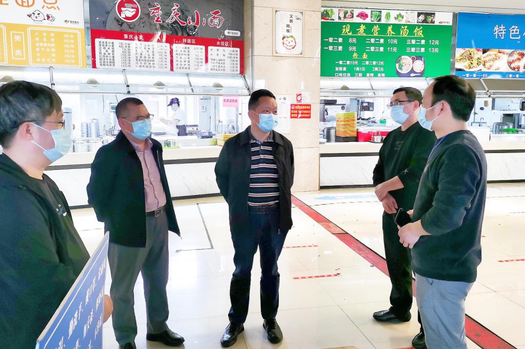 曾繁荣在学生食堂现场重点检查了疫情防控下饮食保障流程、食堂公共区域的清洗消毒和室内通风换气、食品加工生产、食品原材料库存管理、餐饮用具消毒等关键环节。