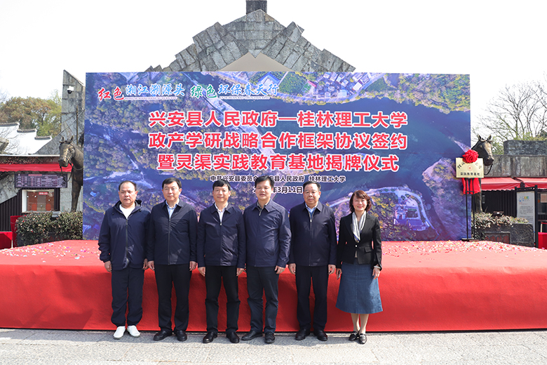 签约仪式上,解庆林校长与贲黄文书记共同为实践教育基地揭牌,梁福沛副校长与韦远明县长分别代表校县双方签订政产学研战略合作框架协议,学校教务处主要负责人与兴安县文广体旅局相关负责人分别代表校县双方签订共建实践教育基地协议。其他与会领导共同见证签约。