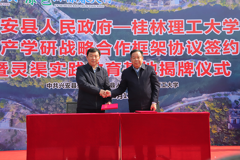 学校副校长梁福沛(右)与兴安县长韦远明签订政产学研战略合作框架协议