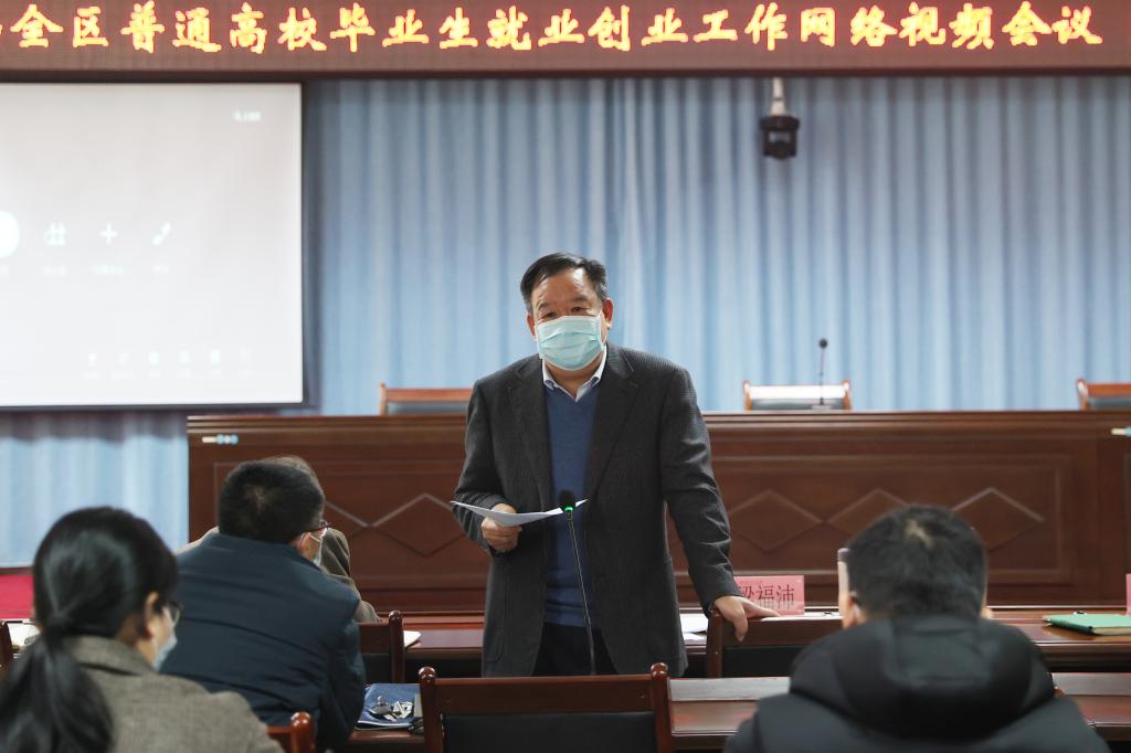 12月22日上午,自治区教育厅、人力资源社会保障厅共同召开2022届全区普通高校毕业生就业创业工作网络视频会议。自治区党委教育工委书记、教育厅厅长刘友谊,人力资源和社会保障厅副厅长蒋劼出席会议并讲话,自治区教育厅副厅长伍春辉主持会议。