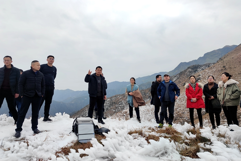 调研中,学校专家组一行先后到灌阳县观音阁乡、西山瑶族乡查看项目总体规划情况,踏雪步行1小时登上海拔1200米的西山滑雪场选址区对项目建设的地质条件、测量测绘、路线规划、景观布局等进行现场勘察。