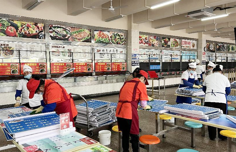 做好开学准备,落细落实后勤保障。为迎接2022年春季学期学生返校开学,后勤服务集团结合疫情防控要求,全力以赴做好各项保障工作,确保新学期后勤服务工作落实到位。饮食中心组织工作人员对食堂进行全面打扫和消毒,按照学校疫情防控要求重新布置食堂大厅,设置餐桌挡板和安排单人单座就餐,设置售卖窗口隔断和间隔一米排队取餐标识等,筹措医用酒精、消毒液、红外测温仪等防疫物资,努力营造安全健康的用餐环境。学生公寓管理中心全面贯彻落实疫情防控工作要求,在每日定时清洁消毒消杀的基础上,继续加大消杀防控力度,对走廊、楼梯等学生宿舍公共区域进行全区域消杀,确保消毒全覆盖;同时为保障学生饮水安全、健康,对屏风、雁山两校区所有学生宿舍内的饮水机进行了彻底清洗消毒,不遗漏任何一个角落,“净”待学生归来。物业管理中心对两校区开展了全面、无死角的卫生清消工作,对学校教室、办公场所、图书馆等公共区域进行卫生清理、消毒、通风;同时对人流量较集中的电梯、走廊等区域适当增加消毒次数,积极做好师生校园生活安全保障工作。采购配送中心在寒假期间清空各食堂主、副食仓库,严格执行各项规章制度,强化员工安全意识,安排专业人员做好主、副食仓库的全面消杀工作,完善消毒消杀记录,做好物流通道体温检测、安全消毒工作。大车队对通勤校车进行了全面维护保养与安全检修,落实安全排查工作要求,消除安全隐患;对车体内外进行消毒,车内清洗座椅头套,从细节处积极用心打造“用车放心,乘车舒心”的乘车环境。