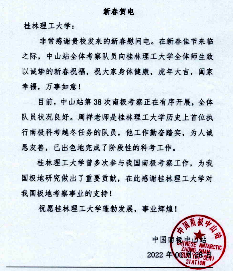 非常感谢贵校发来的新春慰问电。在新春佳节来临之际,中山站全体考察队员向beat365官方网站全体师生致以诚挚的新春祝福,祝大家身体健康,虎年大吉,阖家幸福,万事如意!