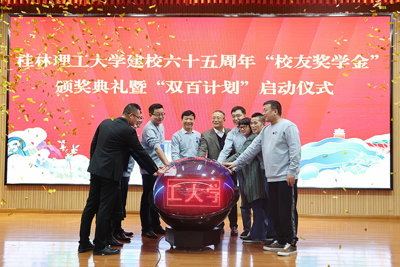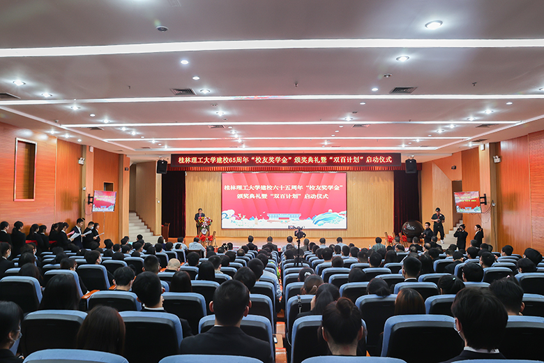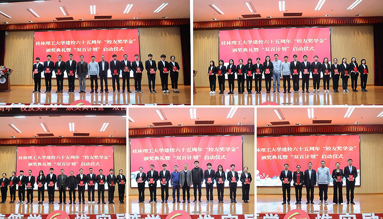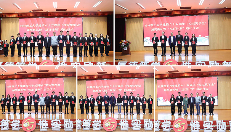 11月11日下午,学校在雁山校区图书馆报告厅举行建校六十五周年“校友奖学金”颁奖典礼暨“双百计划”启动仪式,对获得“袁奎荣奖学金”“行英弟奖学金”“校友金种子奖学金”“建宏科技奖学金”“欣羽优秀人才发展奖”“欣羽奖学金”“盈趣科技奖学金”“汉军创新创业奖学金”“尺度测绘奖学金”及“莱倩国际产学研奖学金”的224名同学和4名老师予以表彰奖励。