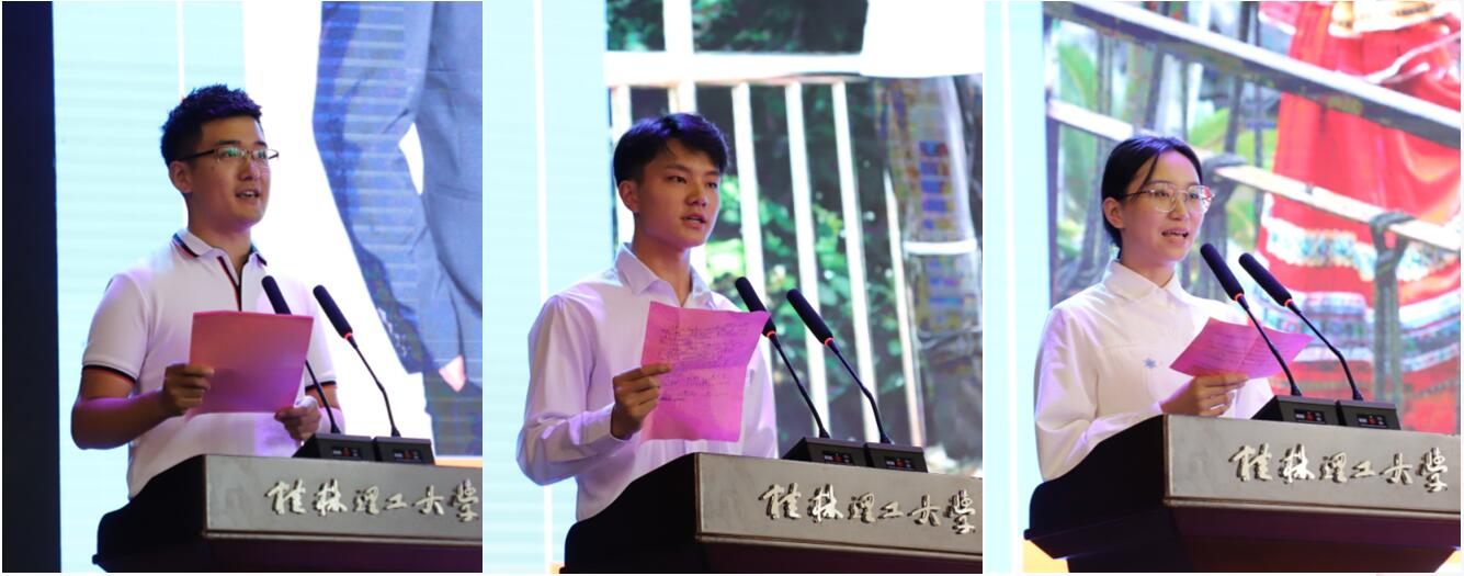 在校生代表、电气与电子工程系通信工程18-本3班贺鹏飞同学分享了自己在桂工的学习生活经历及感悟,希望学弟学妹们在桂工这个新起点上,乘势而上、乘风破浪,做一个与时代同行的弄潮儿。2021级专科新生代表、电气与电子工程系电子信息工程技术2021级2班涂济溥同学表示,将用勤奋刻苦去累积远大的理想,尊师好学,持之以恒,努力将自己塑造成为适应现代社会需求的既有理论知识水平,又有实践操作能力的新型人才。2021级本科新生代表、土木与测绘工程系地理空间信息工程2021级1班李营梦同学号召新生们做到责任在肩,奋发向上,秉承“厚德笃学,惟时励新”的桂工校训,以“德”为本,用信念坚定理想,孜孜不倦,做一个心胸宽广、勤奋好学、求真务实、艰苦奋斗、开拓创新的桂工学子。