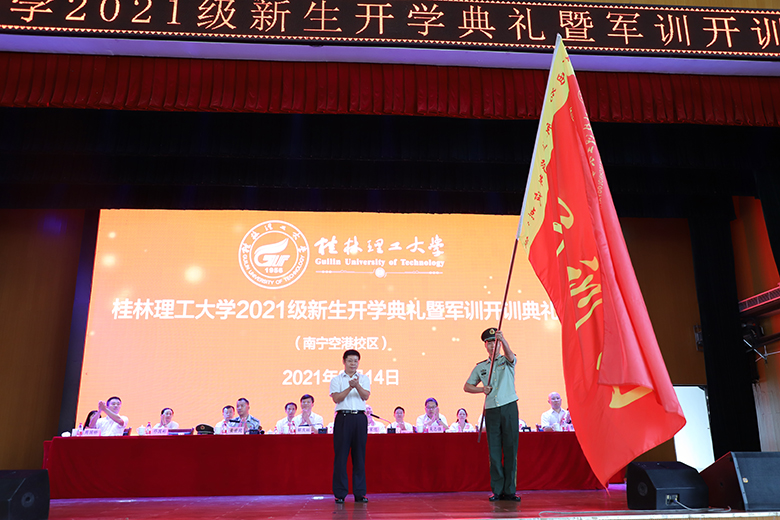 最后,南宁分校2021级新生进行集体宣誓。学校副校长邓国彬为军训团授旗。