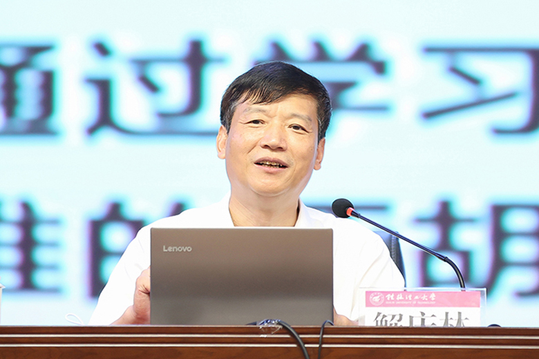 报告内容分为“认识我的大学”和“追逐我的大学梦”两部分。在“认识我的大学”部分,解庆林从学校“五改归属,十易校名”的发展历程讲起,通过呈现珍贵的历史照片,图文并茂地展示学校改革开放以来创下的骄人成绩和进入新世纪以来获得的新发展,讲述一代代桂工人爱岗敬业、无私奉献的感人故事;通过介绍桂工建校65年的光辉历程,为同学们生动阐释“厚德笃学、惟实励新”的桂工校训、“艰苦创业、敬业奉献、团结协作、开拓创新”的桂工精神。解庆林指出,当前学校正奋力推进“双一流”建设,为建设特色鲜明、国内知名的高水平理工大学不懈努力。