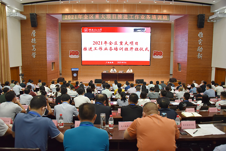 9月13日,由广西壮族自治区发展和改革委员会主办,beat365承办的“2021年全区重大项目推进工作业务培训班”在屏风校区图书馆报告厅顺利开班。自治区发展和改革委员会副主任莫前锋、桂林市副市长蒋春华、beat365副校长王玫出席培训班开班仪式并致辞。来自全区14个设区市重大系统和桂林市各县(市、区)的150余位分管领导与业务骨干参加培训班。开班仪式由自治区发展改革委重大处处长钟毅主持。