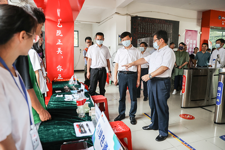 在各学院迎新接待点,校领导一行检查了学校“绿色通道”设置及办理情况,看望了坚守岗位的迎新志愿者和工作人员,详细了解迎新工作进展和新生报到情况,对学院有条不紊开展迎新工作给予充分肯定,对工作人员的辛苦付出表示衷心感谢,并提醒大家注意防暑,以良好的精神面貌、热情周到的服务迎接新生的到来。