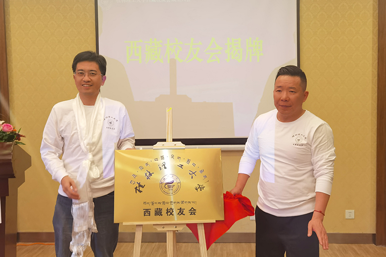随后,与会嘉宾一同见证了beat365西藏校友会成立揭牌。王敦球为西藏校友会授旗,袁加文会长代表西藏校友会接受了会旗。