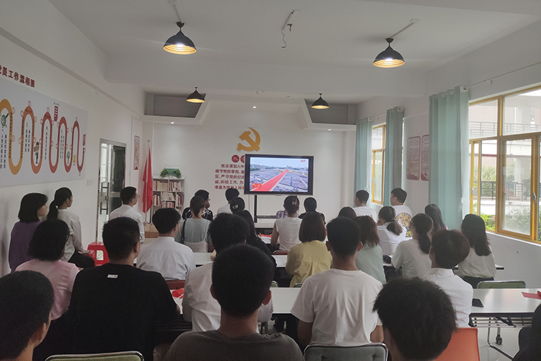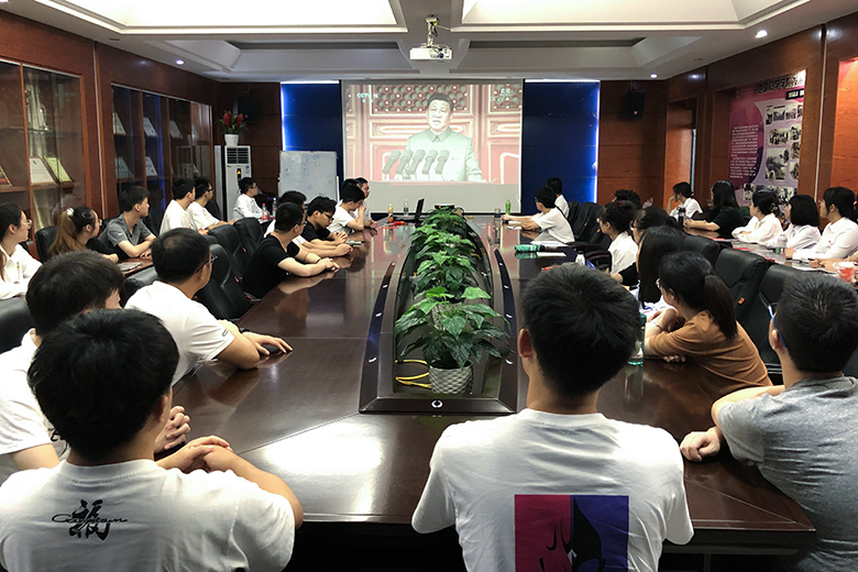 早上8时整,庆祝大会正式开始,56门礼炮鸣放100响,五星红旗冉冉升起,激昂雄壮的国歌声响彻天安门广场。观看直播的全体干部师生自觉凝神肃立,同唱国歌。全体干部师生认真聆听了习近平总书记饱含深情的讲话,大家群情激昂、倍受鼓舞,心中涌动着浓浓的爱国情。庆祝大会在雄壮的国际歌声中结束。大会结束后,干部师生们齐挥小党旗,齐唱《歌唱祖国》,深情表达对党和祖国的热爱和感恩。