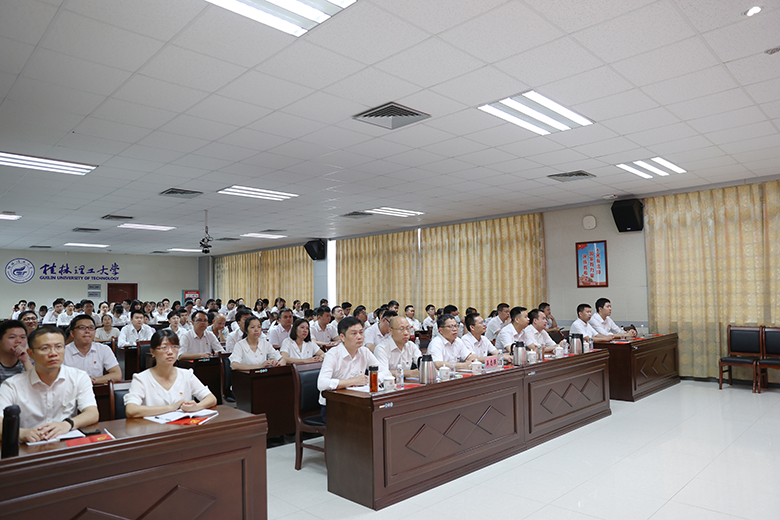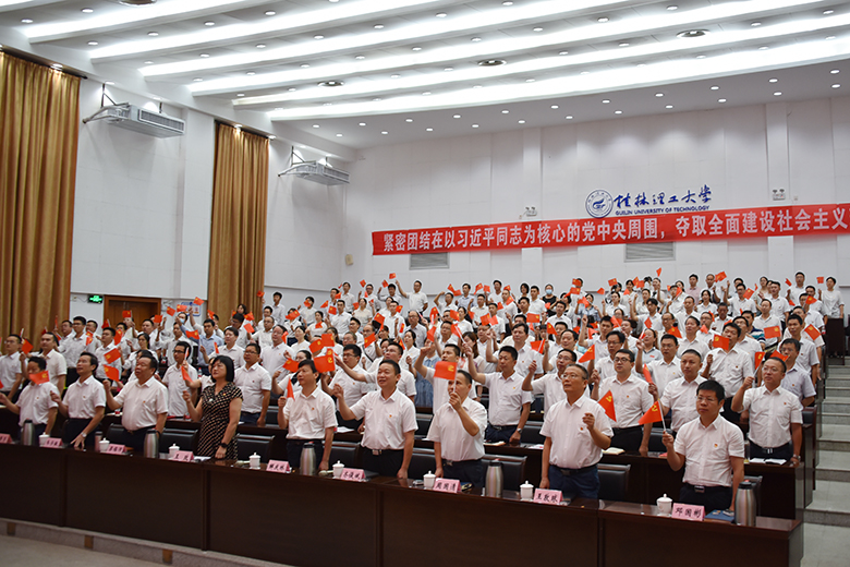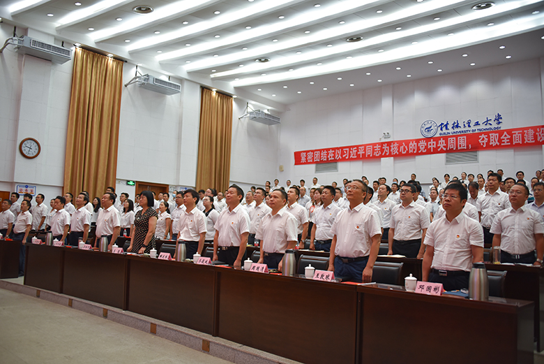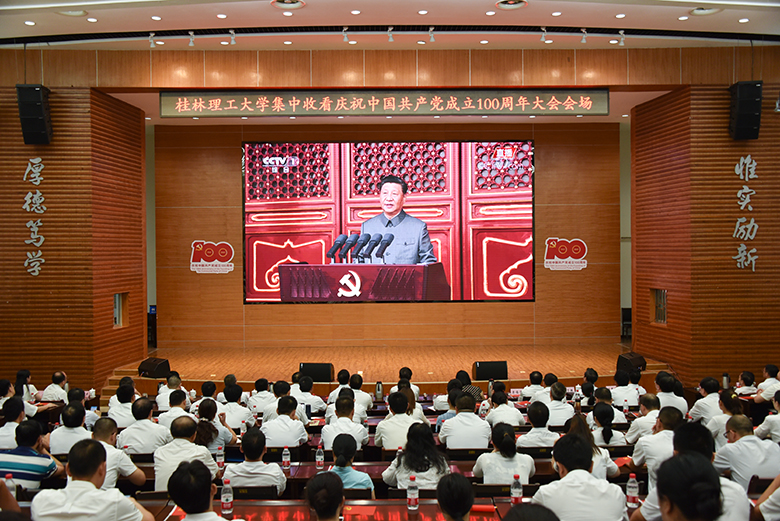 在家校领导解庆林、齐俊斌、吴志强、王玫、周国清、梁福沛、王敦球、韦学敏、邓国彬、曾繁荣,学校党委委员、机关党委全体党员、党外代表人士及师生代表在屏风校区图书馆报告厅、雁山校区行知楼A406会议室集中收看了庆祝大会盛况。南宁分校设分会场。