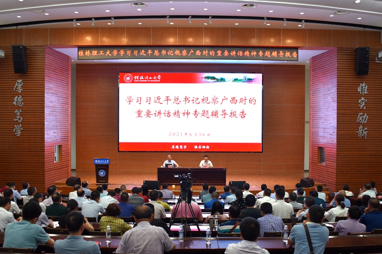 6月16日上午,学校在屏风校区图书馆报告厅举办学习习近平总书记视察广西时的重要讲话精神专题辅导报告会,邀请广西社会科学院党组书记、院长陈立生到校作专题辅导报告。报告会由学校党委副书记、校长解庆林主持,在家校领导齐俊斌、吴志强、王玫、梁福沛、王敦球、韦学敏、邓国彬、曾繁荣,学校全体中层干部参加会议,南宁分校设分会场。