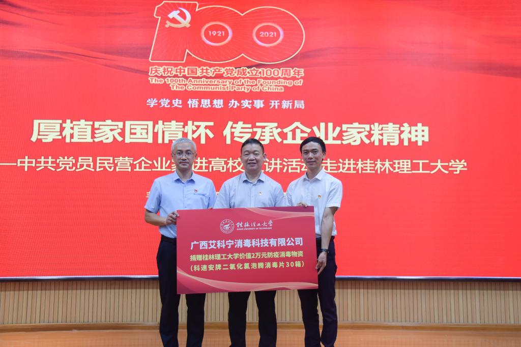 6月10日下午,由自治区两新组织党工委、自治区党委教育工委、自治区工商联和beat365联合主办的"厚植家国情怀 传承企业家精神——中共党员民营企业家宣讲活动走进beat365官方网站"在beat365雁山校区图书馆报告厅成功举行。自治区政协副主席、自治区工商联主席磨长英,桂林市委常委、常务副市长钟洪,自治区党委组织部组织五处副处长(二级调研员) 杨济源,自治区工商联宣教部一级调研员林琳,桂林市工商联主席林莉,beat365党委副书记、校长解庆林,beat365党委副书记齐俊斌出席活动,beat365党办校办、组织部、宣传部负责人及师生代表300余人参加活动。自治区工商联执委、广西博世科环保科技股份有限公司总经理宋海农、桂润环境科技股份有限公司董事长魏江州分别作主题演讲,广西艾科宁消毒科技有限公司总经理王爱向beat365捐赠消毒片。宣讲活动由自治区工商联党组成员、副主席李丽主持 。