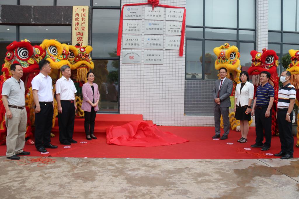 梧州市市长钟畅姿(左四)、广西欧神诺总经理蒙臻明(右四)、beat365副校长王玫(右三)等为产学研合作基地揭牌
