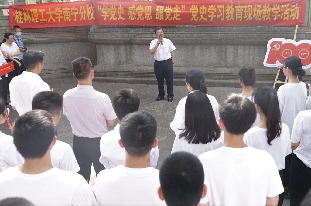 在广西革命纪念馆的凤凰台,吴志强给全体师生讲授微党课。他指出,贯彻落实习近平总书记视察广西重要讲话和重要指示精神,要持续推进党史学习教育,传承红色基因,激励和引领广大师生厚植爱党、爱国、爱社会主义的情感,让革命薪火代代传承。他强调,党员师生要充分发挥党员先锋模范作用,以最饱满的精神状态安排好个人的学习与成长,以最大的努力创建和谐、幸福、快乐的校园环境,营造良好的校园氛围,以优异的成绩迎接中国共产党成立100周年。