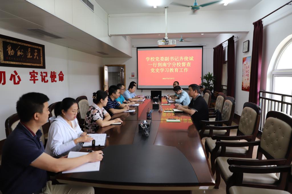 5月27日上午,学校党委副书记齐俊斌到南宁分校检查指导党史学习教育工作。南宁分校党委书记周国桥,分校党委相关负责人,分校党史学习教育领导小组办公室主任、副主任及各工作组组长陪同检查。