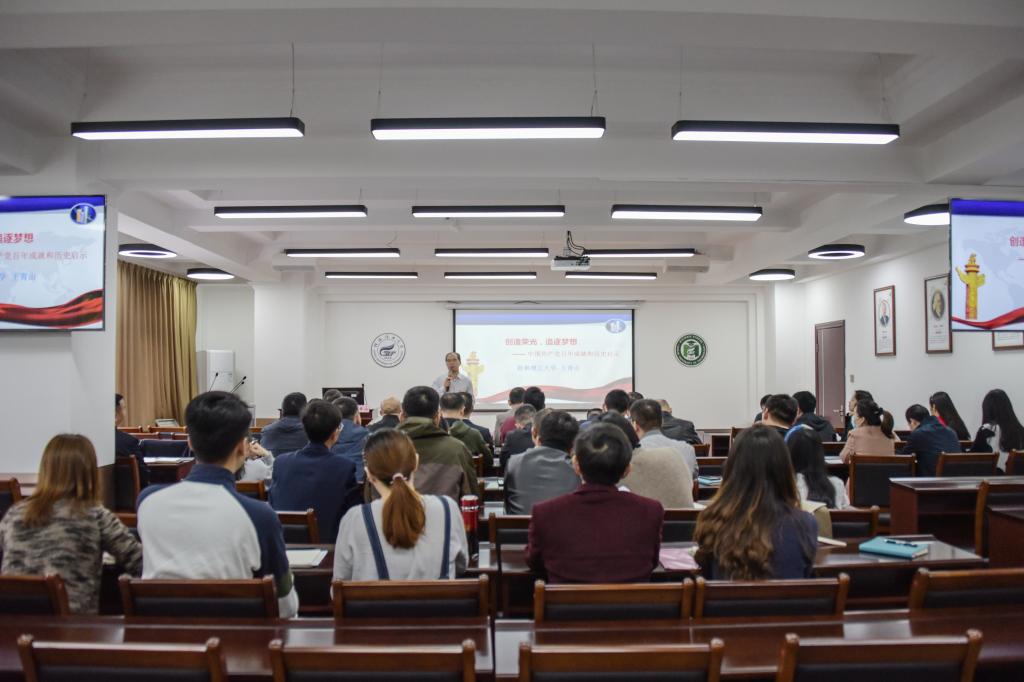 宣讲动员会后,马克思主义学院党委书记王青山同志以“创造荣光,追逐梦想——中国共产党百年成就和历史启示”为题,从“为什么要开展党史学习教育”“一百年奋斗取得的辉煌成就”两方面对同志们进行培训。