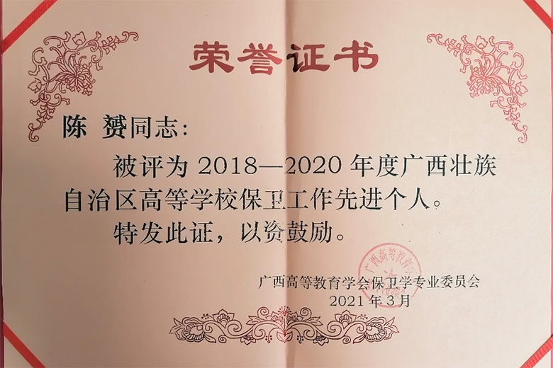 陈赟同志被评为“2018-2020年广西壮族自治区高等学校保卫工作先进个人”