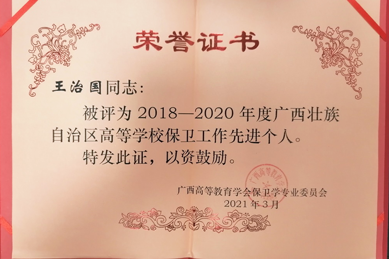 王治国同志被评为“2018-2020年广西壮族自治区高等学校保卫工作先进个人”