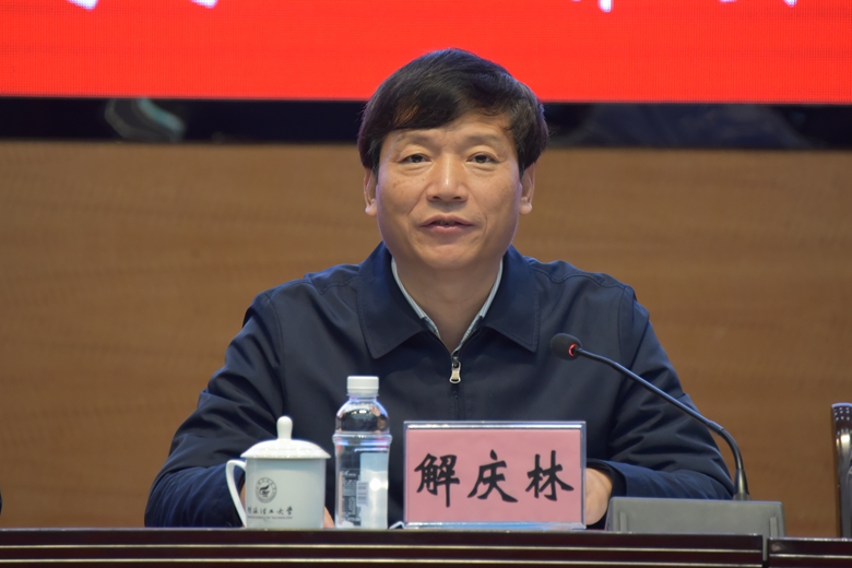 解庆林表示,2021年是中国共产党成立100周年大庆之年,是“十四五”开局起步之年,做好2021年学校各项工作,至关重要,意义深远。他指出要准确把握2021年学校工作的总体要求:以习近平新时代中国特色社会主义思想为指导,全面贯彻党的十九大和十九届二中、三中、四中、五中全会精神以及习近平总书记关于教育的重要论述,认真落实自治区党委十一届九次全会精神,进一步增强“四个意识”、坚定“四个自信”、做到“两个维护”,按照学校第三次党代会目标任务部署,以推动高质量发展为主题,以深化综合改革为动力,加强党对学校工作的全面领导,全面贯彻党的教育方针,落实立德树人根本任务,推进学校各项事业协调发展,实现“十四五”良好开局,以优异成绩庆祝建党100周年。2021年,我们要重点抓好七个方面工作:一是坚持和加强党的全面领导,以高质量党建引领推动事业高质量发展;二是持续深化学校综合改革,增强事业高质量发展动能;三是创新人才培养模式,持续提升人才培养质量;四是加强人才队伍和学科建设,提升办学竞争力;五是坚持服务地方战略,大力提升科技创新和服务能力;六是加强校园建设管理,强化资源支撑和服务保障能力;七是全力创建平安文明和谐校园,用心打造育人高地。