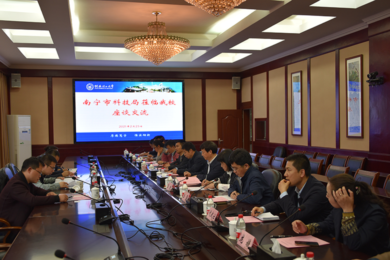 2月25日下午,南宁市科技局党组书记王亚楠一行4人来访beat365。学校校长解庆林、副校长王玫、副校长邓国彬在屏风校区教八楼三楼会议室热情接待了来访客人。学校党校办、科技处、国际交流处、基建后勤处、研究生院、南宁分校等相关部门负责人及学校相关科研团队负责人参加座谈交流。