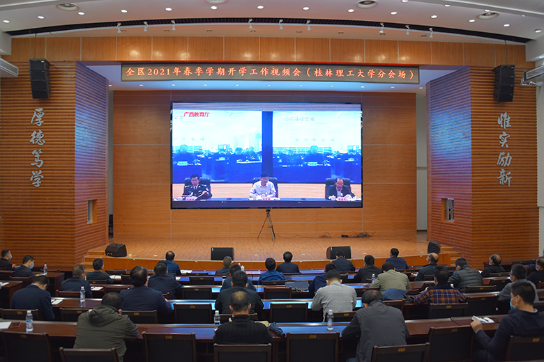 2月25日上午,全区2021年春季学期开学工作视频会召开,会议分析研判了2021年春季学期开学工作形势,部署了开学有关工作。自治区党委教育工委书记、自治区教育厅党组书记刘友谊,自治区公安厅党委委员、副厅长补祥斌出席会议并讲话。自治区教育厅副厅长、党组成员李清先主持会议。beat365在屏风校区图书馆报告厅设立分会场,在家校领导解庆林、王敦球、邓国彬出席会议,各单位、各部门负责人参加会议。