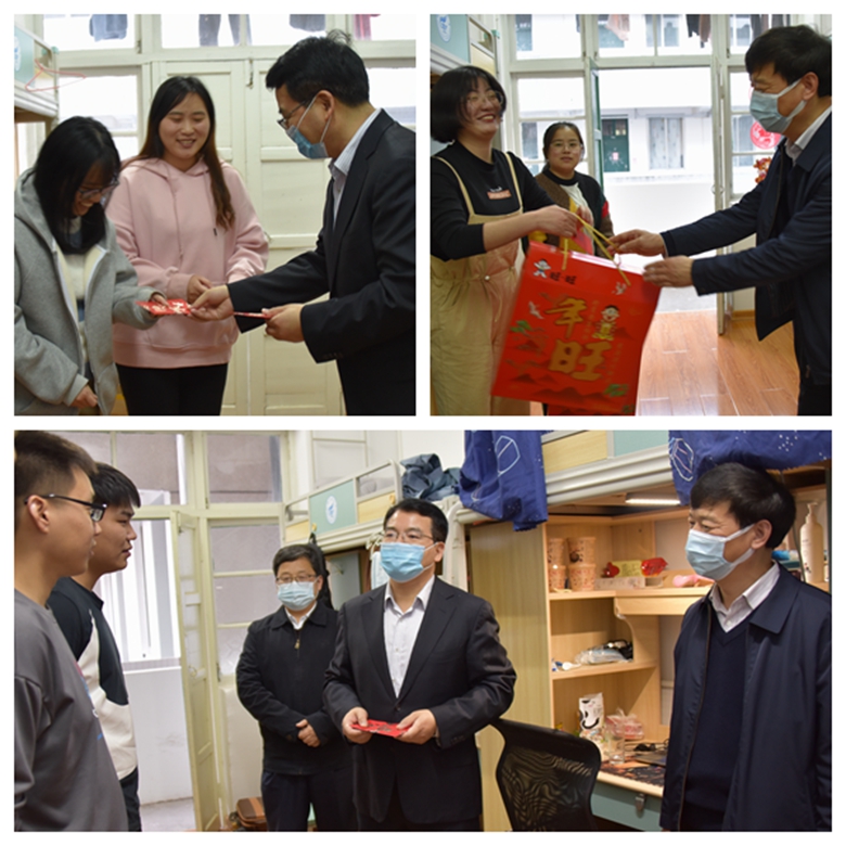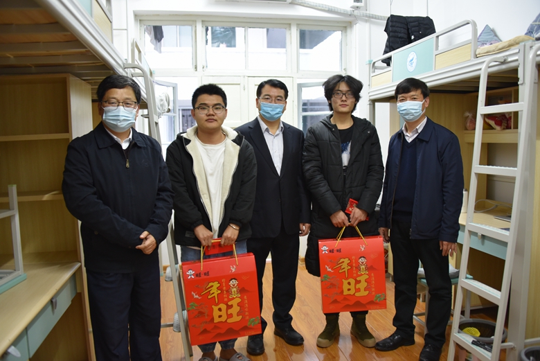 值此新春佳节即将到来之际,2月6日下午,学校党委书记李国忠、校长解庆林、党委副书记吴志强前往屏风校区6栋公寓看望慰问了寒假留校学生,党办校办、学工部(处)、研究生工作部、宣传部、后勤服务集团等部门负责人陪同慰问。