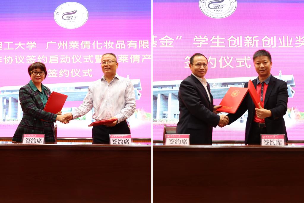 奖学金设立签约仪式中,王敦球、周国清分别与广州莱倩化妆品有限公司和汉军集团相关负责人签订beat365官方网站、广州莱倩化妆品有限公司产学研战略合作暨“莱倩产学研奖学金”设立协议和“汉军基金”学生创新创业奖学金设立协议。