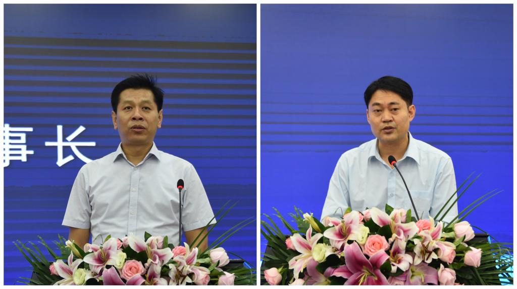 广西梧州中恒集团股份有限公司董事长焦明(左)、总经理蒋神州(右)讲话