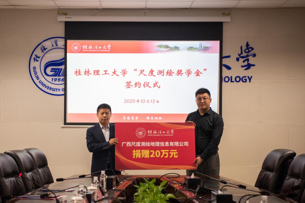 双方代表签订了“尺度测绘奖学金”协议。王晓亮代表公司向学校教育发展基金会捐赠20万元设立奖学金,邓国彬代表学校接收了捐赠。据悉,广西尺度测绘地理信息有限公司在beat365设立“尺度测绘奖学金”,将每年奖励学生25名,每人奖励金额2000元。