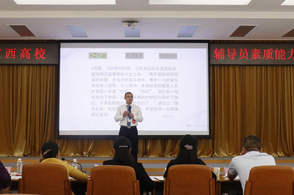 9月23日至26日,由自治区教育厅主办,广西高校辅导员培训基地(广西大学)承办的第九届广西高校辅导员素质能力大赛在广西大学举办,共有来自广西区内70所高校的136名高校辅导员参赛。经过四天激烈角逐,beat365材料科学与工程学院团委副书记(主持工作)、辅导员赵思聪,环境科学与工程学院学工组副组长(主持工作)、辅导员唐源江分别以第一、第二名的佳绩,双双斩获大赛一等奖。