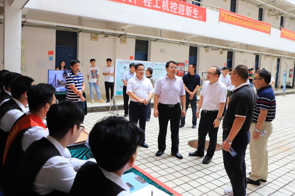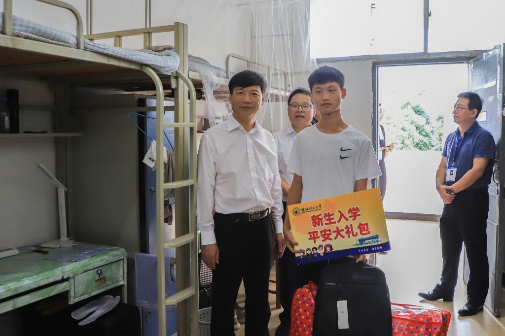 学校党委书记李国忠、校长解庆林、党委副书记吴志强、副校长周国清等校领导在相关部门负责人的陪同下深入迎新现场,走访了学校迎新接待站、各学院迎新接待点、新生宿舍和雁山校区体育馆,详细了解各学院、各部门迎新工作组织情况和工作进展。校领导亲切慰问参加迎新的工作人员和志愿者,对他们的辛勤付出表示感谢;热情关怀前来报到的新生,详细了解他们的情况,并为同学们送上平安大礼包,叮嘱他们安心学习;要求相关部门加强工作,为新生提供良好的学习生活环境,帮助他们尽快适应大学新生活。