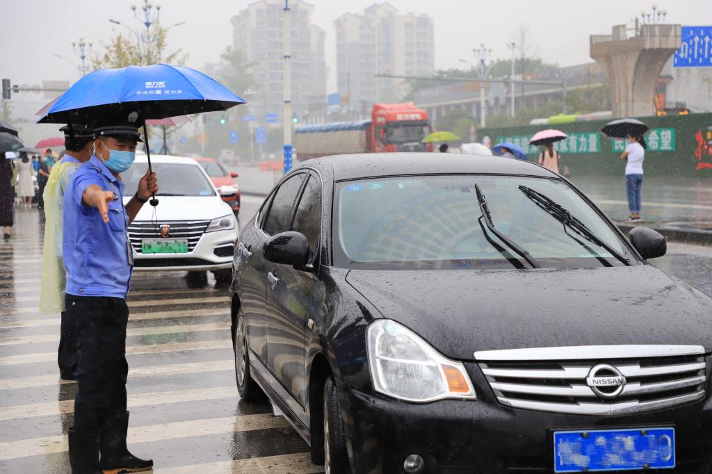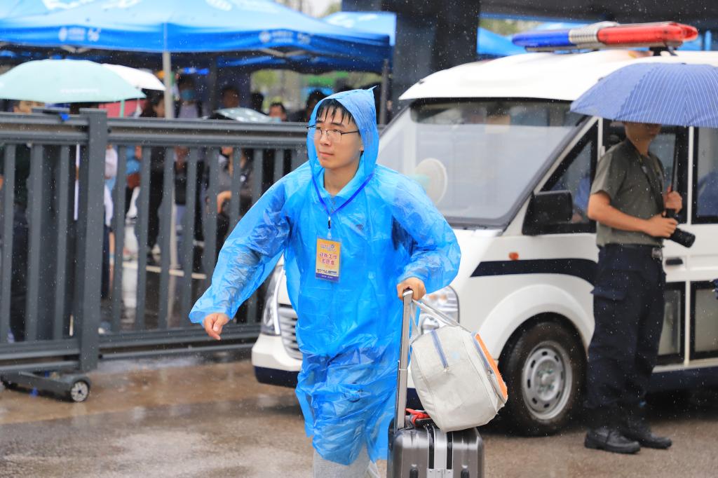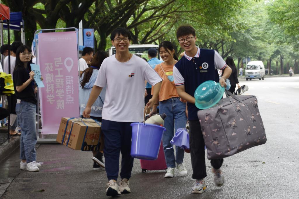 志愿者冒雨为新生搬运行李
