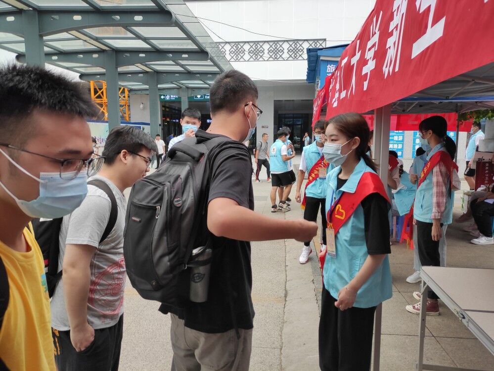 志愿者在火车站迎接新生
