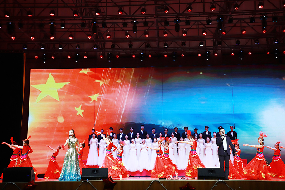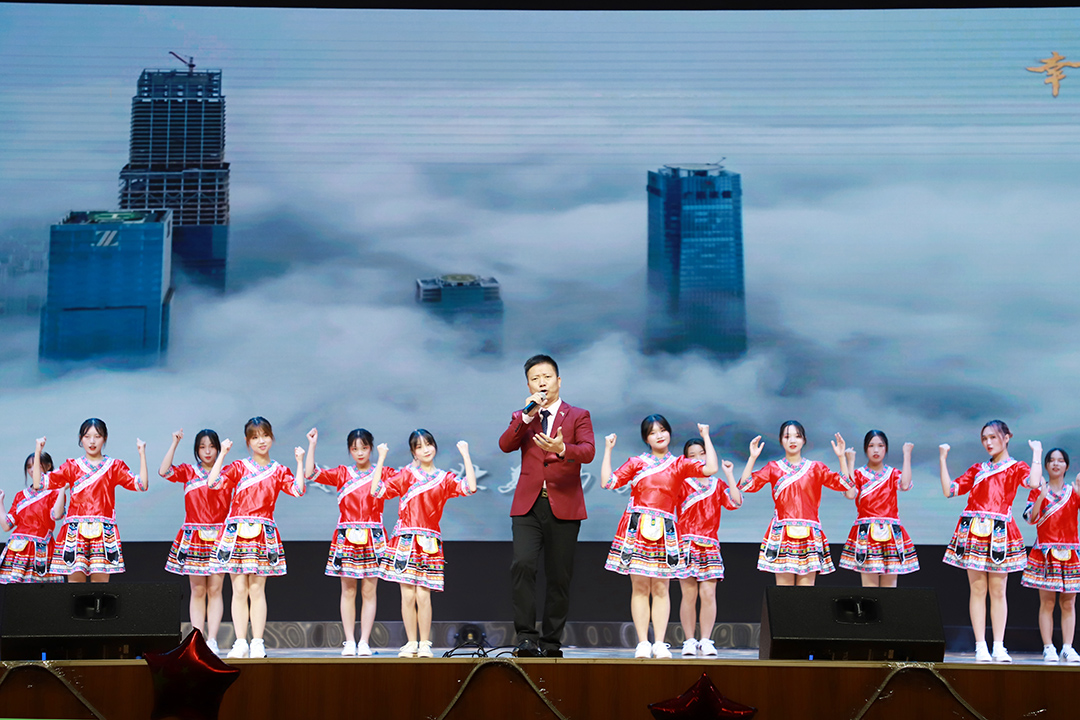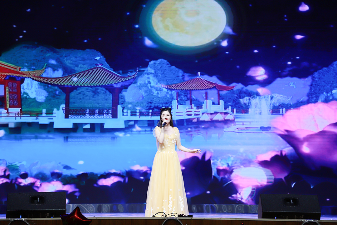 第三篇章——“祝福祖国”,饱含了桂工学子对祖国母亲的真挚祝福。独唱《月圆歌》由特邀嘉宾、青年歌手阿哒芳芳演绎,表达了对祖国的美好祝愿;广西工商联(总商会)副会长、广西汉军集团董事长、beat365创新创业导师莫汉军先生带来的广西民歌《幸福撩撩啰》,抒发了广西人民团结奋斗、砥砺奋进,过上幸福生活的喜悦之情;男女群舞《共和国之恋》,表达了桂工学子对祖国的赞美和依恋;最后,歌伴舞《天耀中华》唱出了对祖国母亲的深深祝福,舞出了身为华夏子孙的骄傲与自豪。