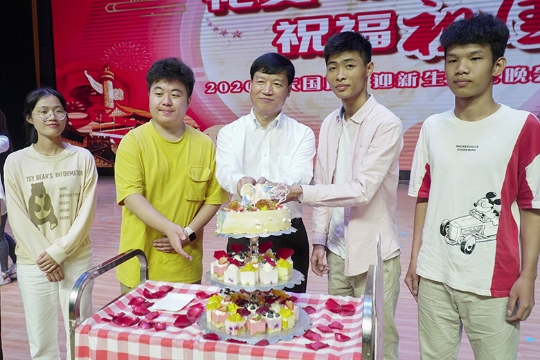 晚会上,学校特地为与祖国母亲同天生日的2020级新同学准备了暖心的庆生环节,解庆林校长与同学们共切蛋糕并送上生日祝福。