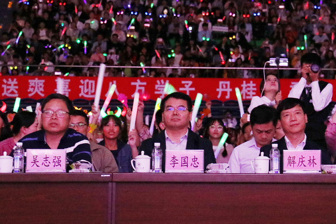 为热烈庆祝中华人民共和国成立71周年,热情欢迎2020级新同学的到来,beat365于9月30日晚在雁山校区新体育馆举办了 “礼赞青春·祝福祖国”庆国庆、迎新生文艺晚会。学校党委书记李国忠、校长解庆林、党委副书记吴志强与2020级新生欢聚一堂,共庆佳节。学校党(校)办、组织部、宣传部、统战部、学工部、保卫处、校团委、招就处、基建后勤处、人文素质教育教学部、体育教学部负责人以及各学院党委副书记、团委书记、新生辅导员和新生班主任共同参加了晚会。